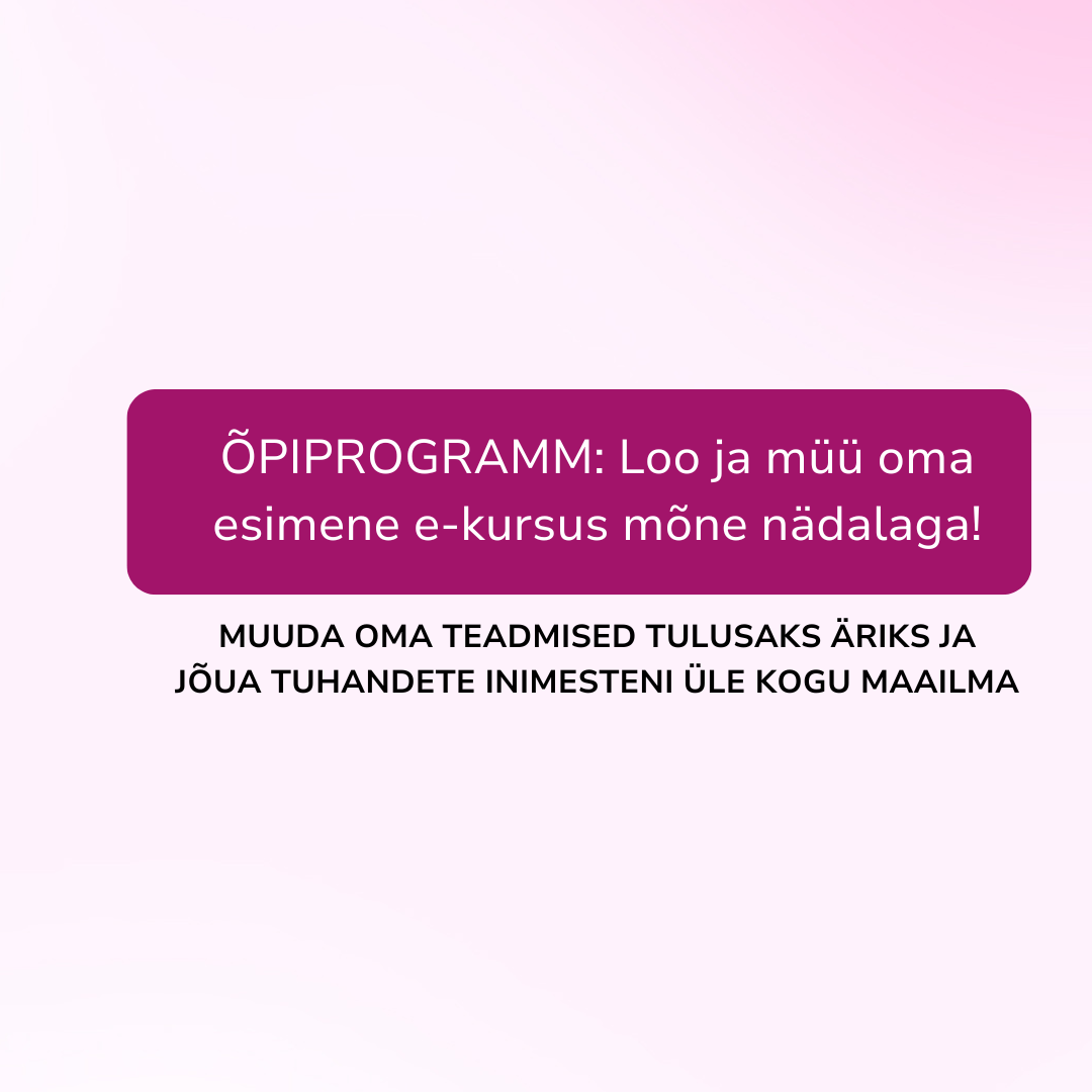Õpi samm-sammult looma ja müüma e-kursust, mis muudab sinu teadmised tulusaks äriks ja aitab sul jõuda sadade ja miks mitte tuhandete inimesteni üle kogu maailma.
